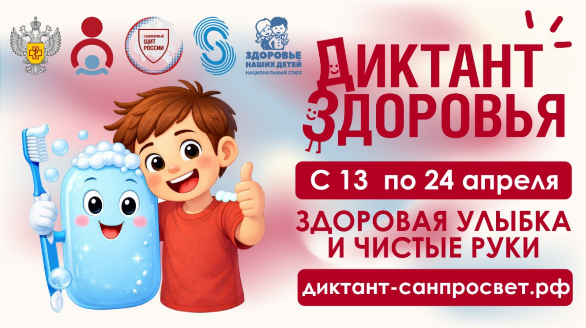 С 13 по 24 апреля 2026 года Роспотребнадзор запускает первый тематический трек Всероссийской санитарно-просветительской акции «Диктант здоровья» — «Здоровая улыбка и чистые руки». Модератором проекта выступает ФБУН «Новосибирский НИИ гигиены» Роспотребнадзора.