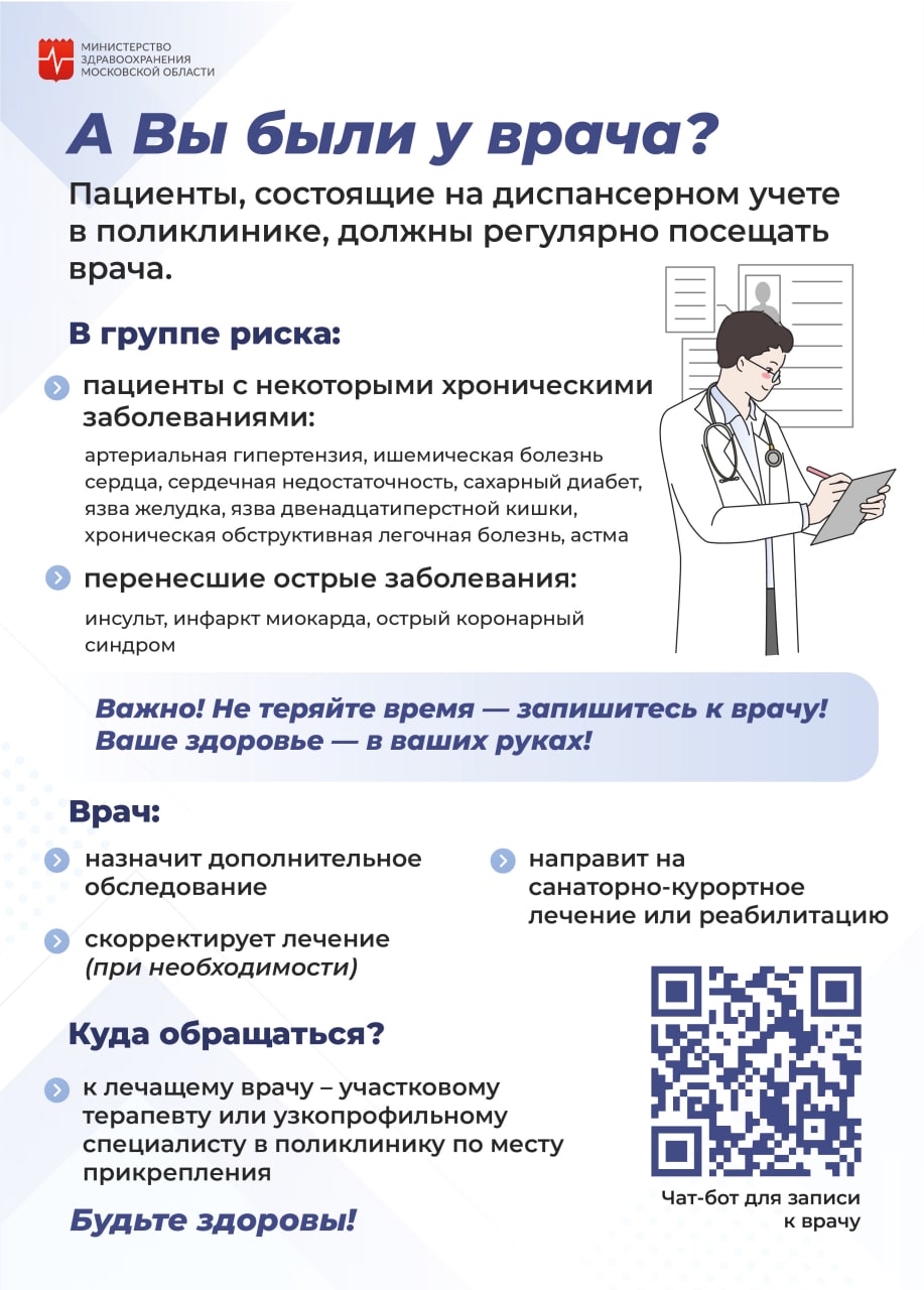 Рекомендуем пациентам с хроническими заболеваниями, которые состоят на диспансерном учете, записаться на осмотр и узнать о своем состоянии.