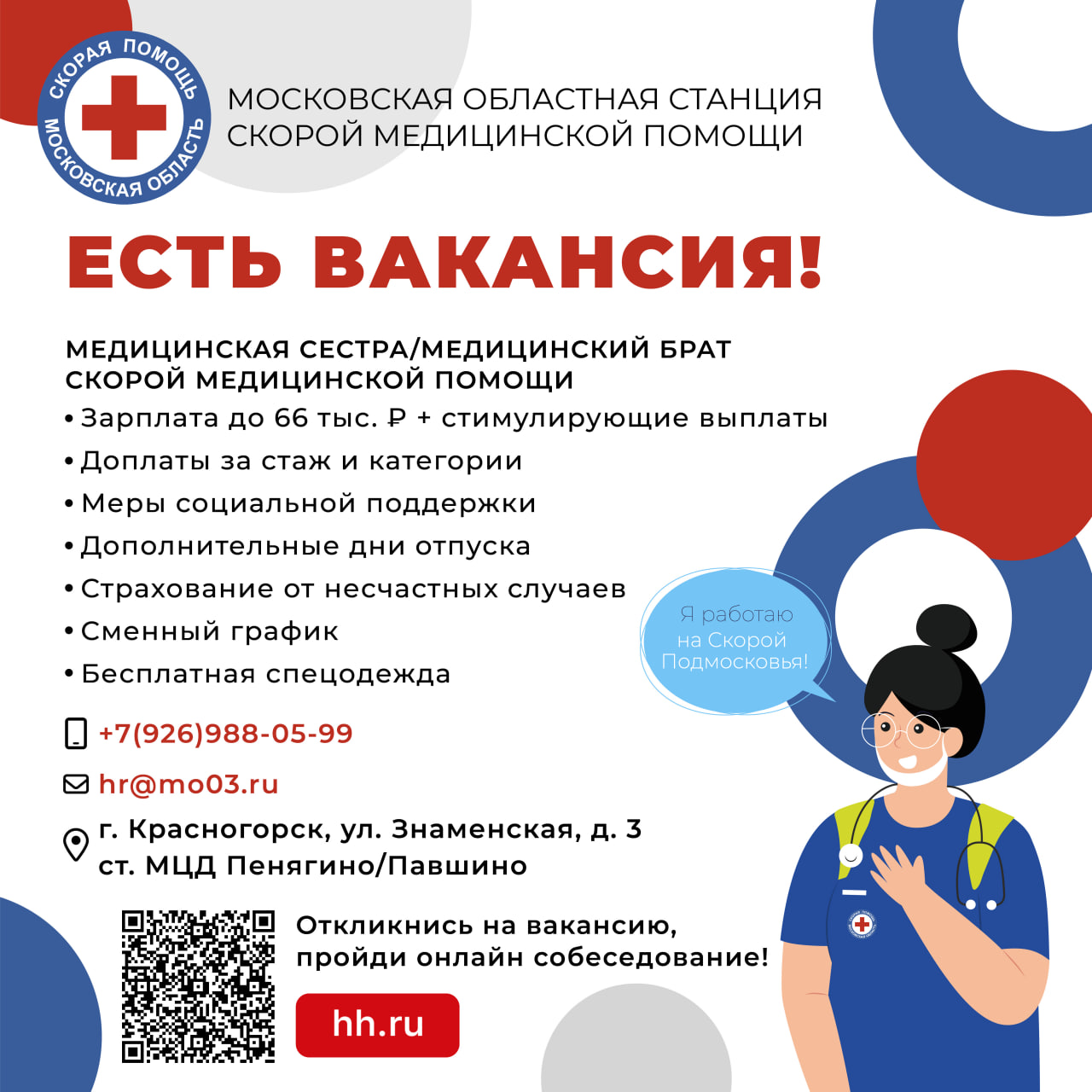 Московская областная станция скорой медицинской помощи приглашает на работу медицинскую сестру/медицинского брата скорой медицинской помощи.